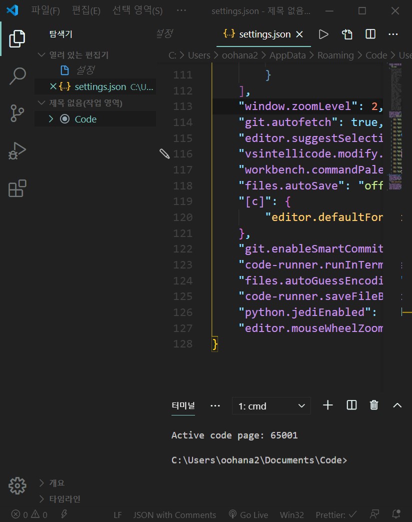 "window.zoomLevel": 0, 이라고 써져 있는 부분을 원하는 배율을 쓰면 해당 배율만큼 확대되게 됩니다. 0.5 라는것은 50%확대라는 뜻입니다. 해당 설정을 원하는대로 변경한 후 저장하게 되면 바로 적용되게 됩니다.