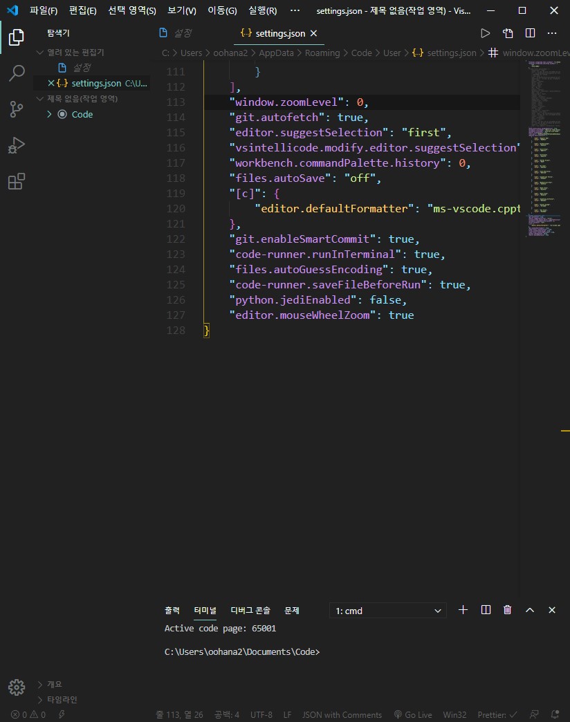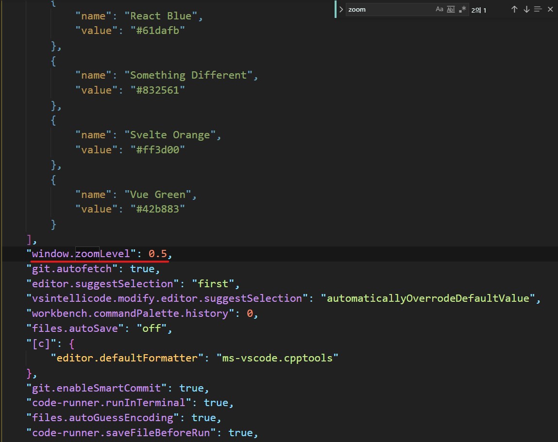 "파일 > 설정 > 기본설정 > 설정 열기(json)" 로 들어간 후 "Ctrl + F" 를 눌러서 "zoom"을 검색해 줍니다.