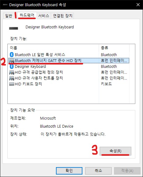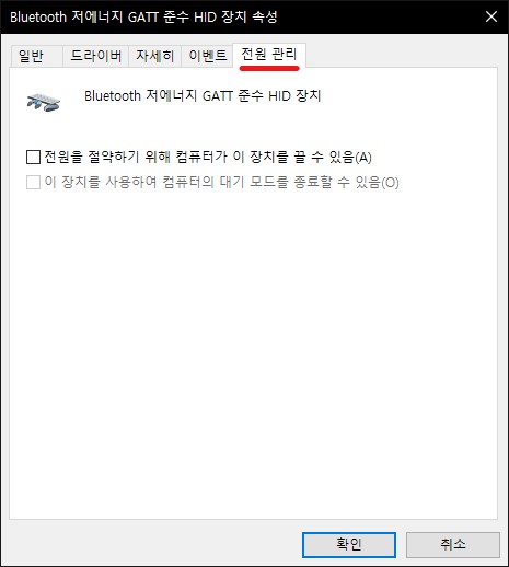 전원관리 탭은 "제어판 - 장치 및 프린터 - 마우스 클릭 - 하드웨어 탭 - bluetooth 저에너지 GATT 준수 HID 장치 속성 - 설정 변경" 을 누르면 나오게 됩니다.