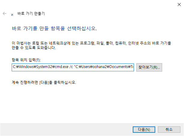 위 명령어를 복사해서 바로가기를 생성합니다.