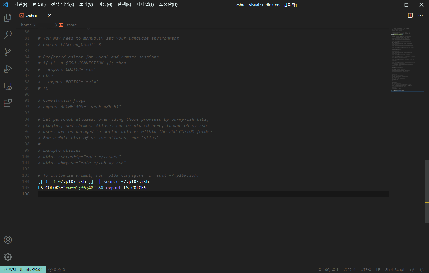 위 코드를 쳐서 power10k를 설치합니다. 설치후 활성화를위해 VScode로 ./zshrc에 등록해야합니다.