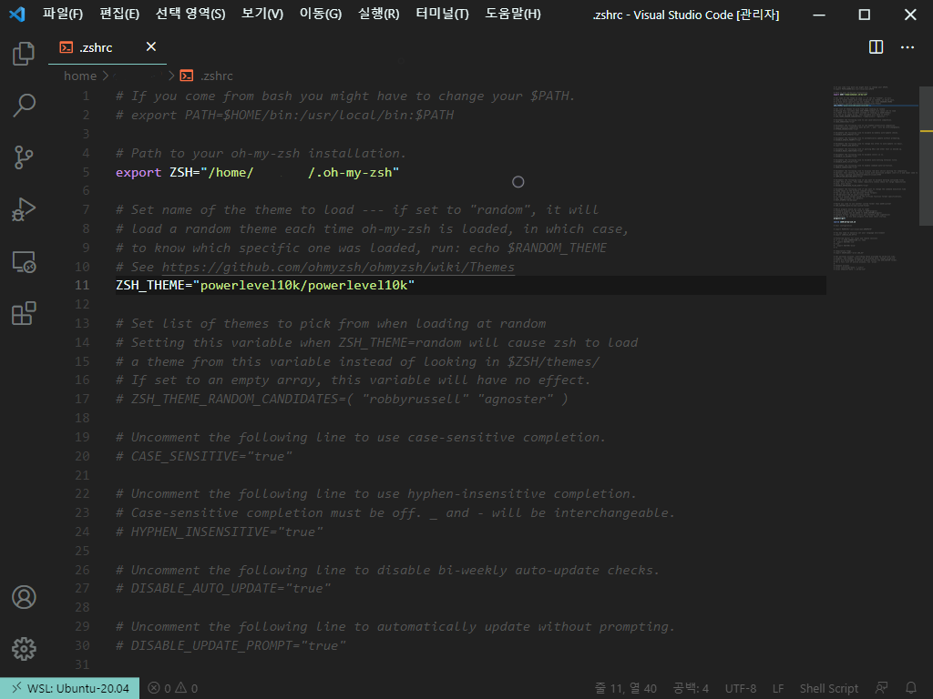 ZSH_THEME에 powerlevel10k/powerlevel10k 를 적어줍니다.