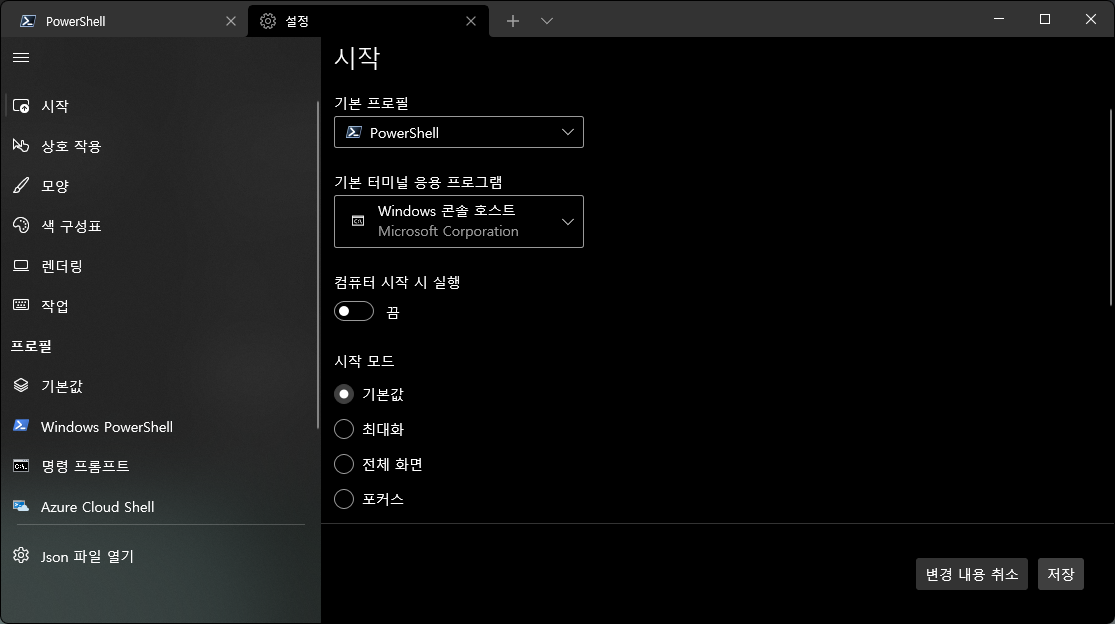 Windows Terminal을 다운로드하고 실행하게되면 자동으로 '기본터미널을 변경하시겠습니까' 라는 드롭다운이 보이게 됩니다. 해당 메뉴를 누르거나 아래 사진처럼 설정을 눌러서 들어가면 됩니다.
