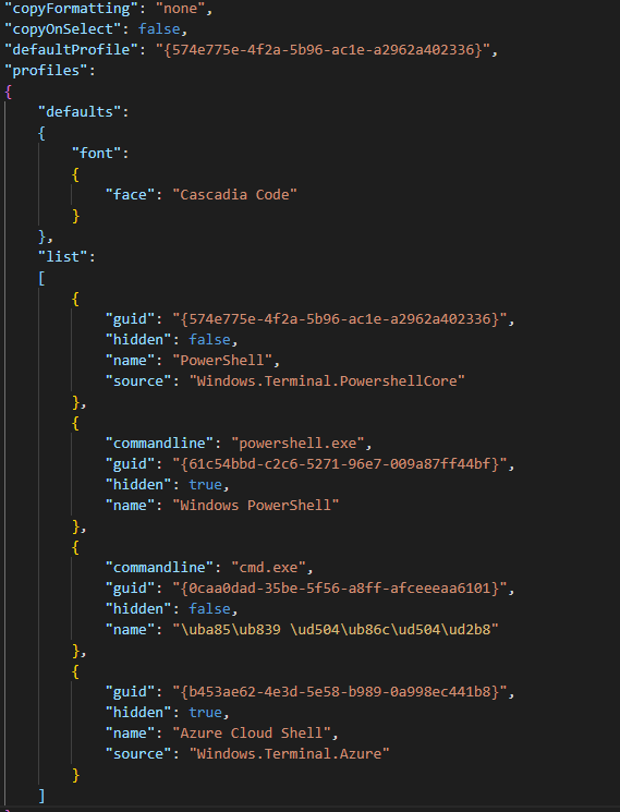 defaultProfile 쪽에 새롭게 설치한 PowerShell 의 guid를 복사해서 옮겨주면 끝입니다.
