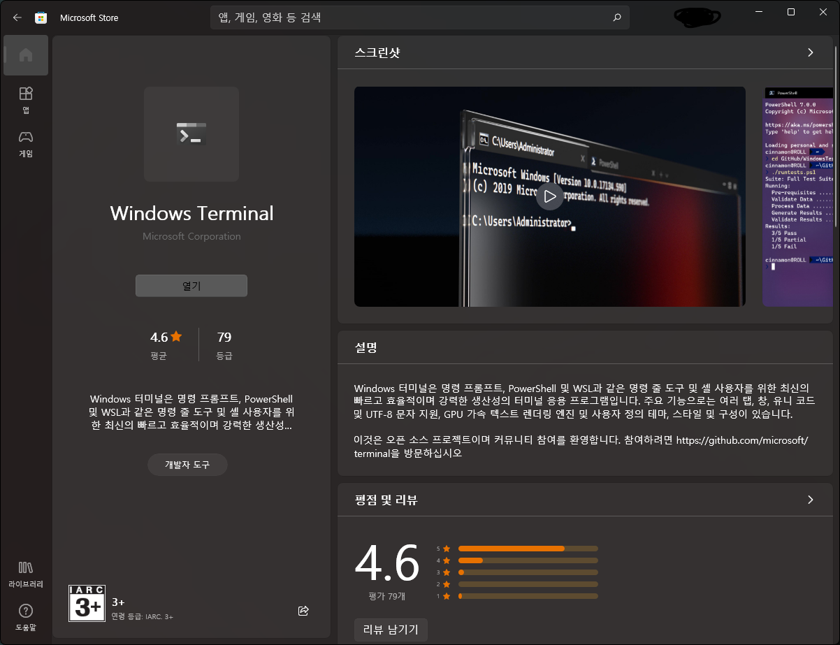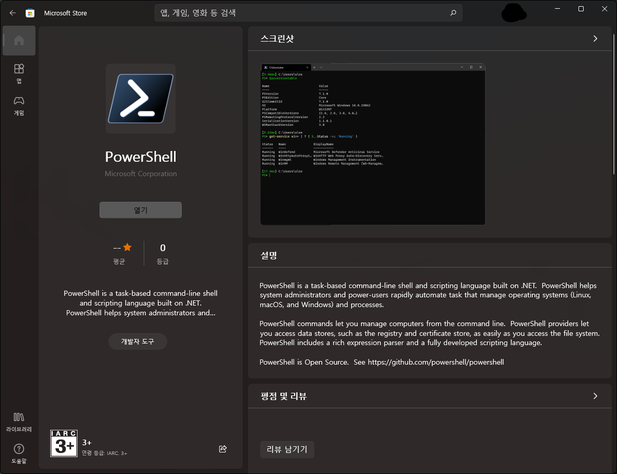 위 링크로 들어가거나 MS스토어에서 직접 검색후 설치하면 됩니다. PowerShell 의 경우 필수는 아니지만 윈도우에 기본으로 깔려있는 버전은 5.x대 버전의 구버전이고 스토어에 있는 버전은 7.x대의 오픈소스로 지속적인 개발이 진행중인 버전입니다. 자세한 차이점은 링크를 들어가서 확인하면됩니다.